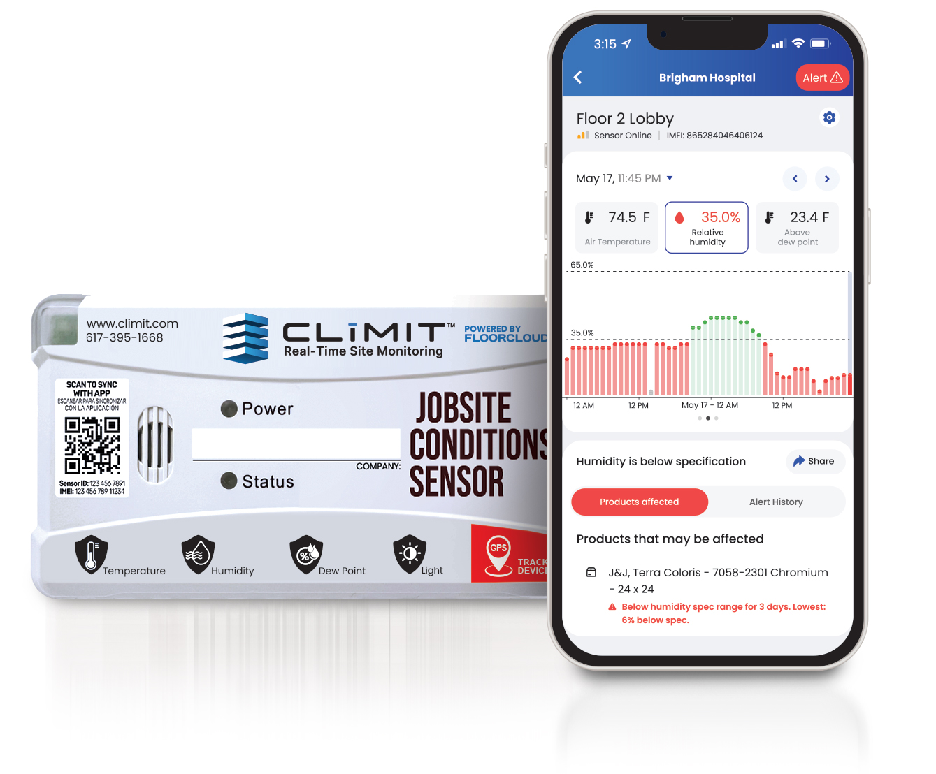Ensure efficiency and prevent costly surprises with the CLīMIT sensors, offering real-time environmental monitoring and mobile alerts to keep your flooring projects on track.